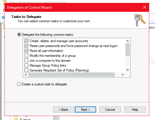 Open the Delegation of Control Wizard by right-clicking the domain Active Directory Users and Computers, and selecting All Tasks.
